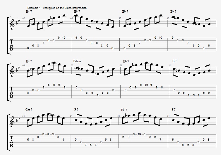 Another exercise that is very useful in terms of getting an overview of the arpeggios and practicing to connect them already is to play one arpeggio and when the chord changes then start the next arpeggio on the closest note. I’ve also made a lesson on doing this with scales: Practicing Scales through changes. As I do in this example: