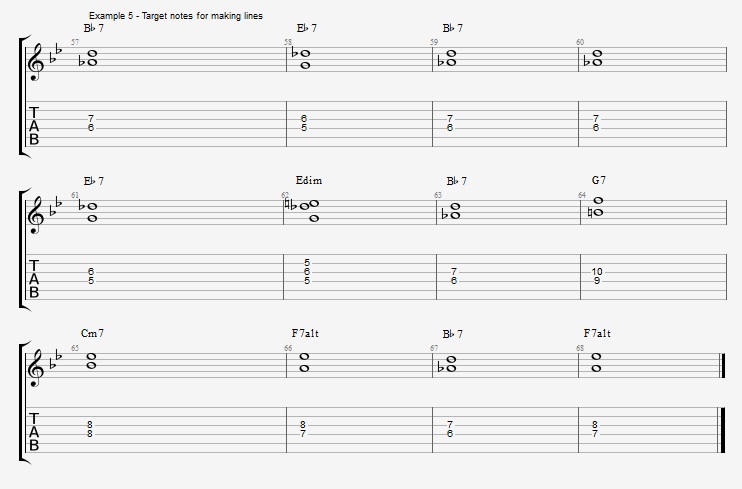 The only place where I deviate from the 3rds and 7ths targets is the E diminished chord which is identical with the Eb7 chord except for the root, so the root is a useful target note in that case (which is not often the case).