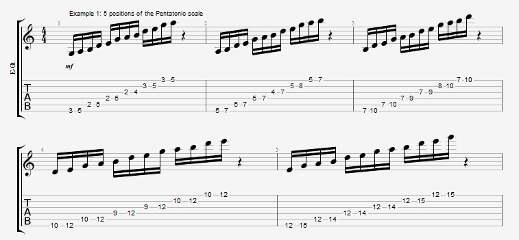 First make sure that you know all 5 positions of the pentatonic scale, since you’ll need them to be able to play the song in one position. Here they are in the key of E minor:
