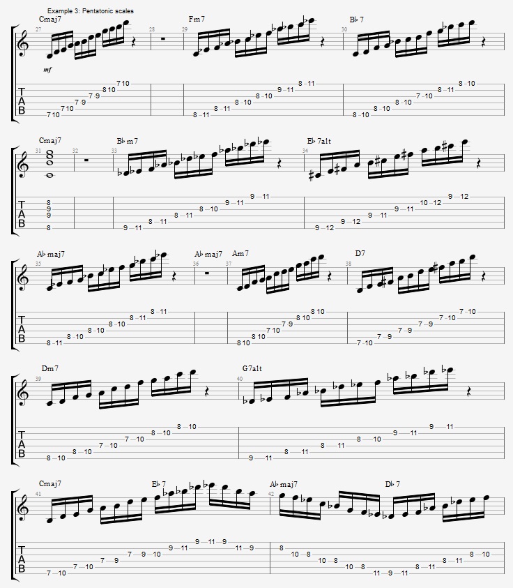 The focus in this lesson is to play through the progression of the Tadd Dameron composition “Lady Bird” by only using pentatonic scales.
