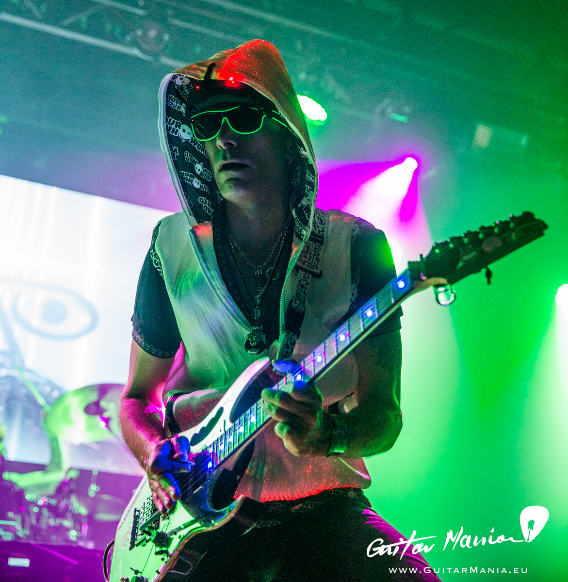 Eingeleitet wurde der Abend mit Vais "Bad Horsie", bei dem der Gitarrist mit Kapuzzenjacke, Neon-Sonnenbrille und zwei Laserbeams - stets professioneller Entertainer, der er ist - die Bühne enterte. "The Crying Machine", "Gravity Storm" und "Whispering a Prayer" komplettierten die Aufwärmrunde, bis mit "Liberty" schließlich der "Passion and Warfare" Showteil eingeleitet wurde.