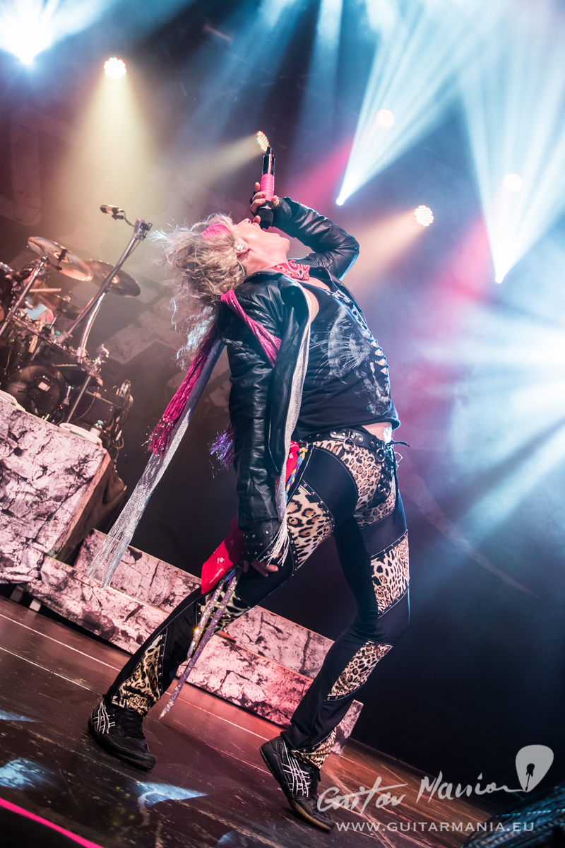 Nach guten 50min Spielzeit und einem anschließenden Break war es dann soweit. Der alt bekannte Panther ertönte aus der Anlage des Gasometers und brachte das Publikum zum Toben. Mit dem Klassiker Eyes Of A Panther eröffneten STEEL PANTHER ihr Set. Es folgte ein Hit nach dem anderem und zur Freude des Publikums wurden auch Songs wie Let Me Cum In oder She’s On The Rag (sogar als Akustik-Alternate Version) dargeboten, die aus dem Live-Set noch nicht so bekannt waren. Einen musikalischen Höhepunkt bot der Gitarrist Satchel mit einem beinahe 7 minütigem Solo an Gitarre und Schlagzeug gleichzeitig. Ein solches hatte man zuletzt nur vor einigen Jahren bei einem Konzert in Japan gesehen!