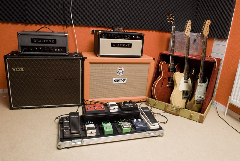 Seit einigen Jahren habe ich einen RC-Booster auf dem Board, er klingt sehr natürlich und hebt das Verstärkersignal etwas an, ohne es zu verfälschen. Um zwischen mehreren Amps hin- und her zu schalten, schwöre ich auf die Switch-Boxen von Lehle, ein altes Vox Wah ist auch immer dabei und ab und zu benutze ich ein altes Fulltone Deja-Vibe. Von Zeit zu Zeit wechseln sich weitere Kandidaten immer wieder ab, aber das sind so die üblichen Verdächtigen :-)